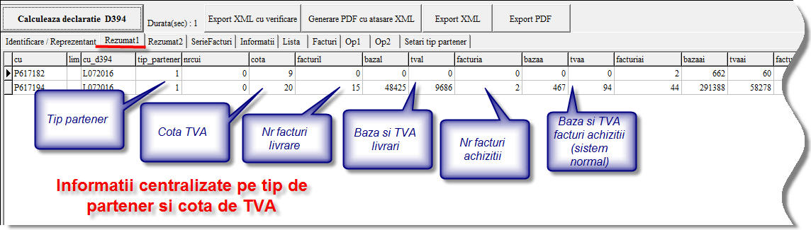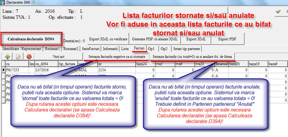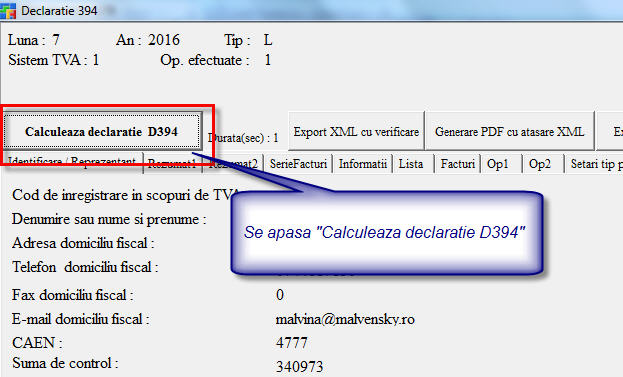 Dupa completarea datelor de identificare, se poate trece la calcularea declaratiei. Se apasa butonul "Calculeaza declaratie D394"