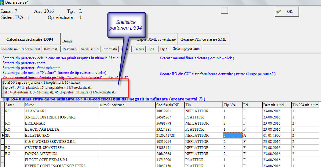 Seteaza pe cele ramase "Neclare" functie de tip (Varianta veche) - va marca partenerii pe Tip 394 in functie de setarile vechi din tabela parteneri (platitor / neplatitor / persoana fizica). Puteti folosi aceasta optiune daca stiti ca partenerii au fost recent verificati si tipurile sunt corecte. Va marca doar partenerii neverificati direct pe mfinante!