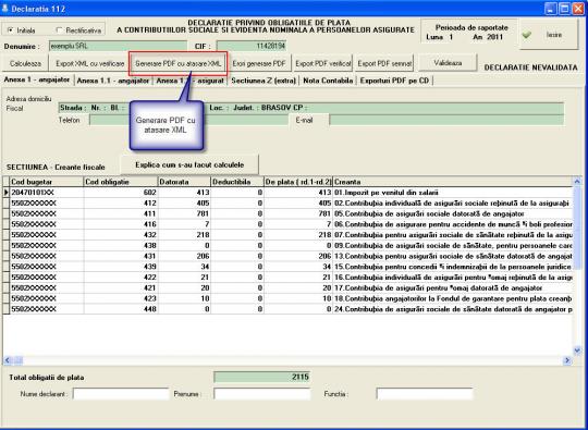 Generarea declaratiei unice 112, generarea si verificarea fiserului XML, generarea fisierului PDF cu atasament