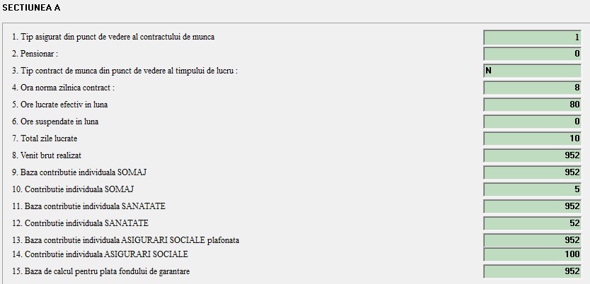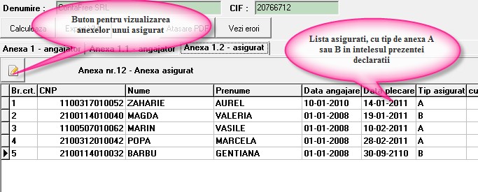 Lista asiguratilor este afisata in tabelul de mai jos. Tip asigurat =A daca nu are mai multe contracte, nu are concedii medicale, nu are scutiri la plata si nu a lucrat in conditii deosebite sau speciale. Tip asigurat = B in rest.