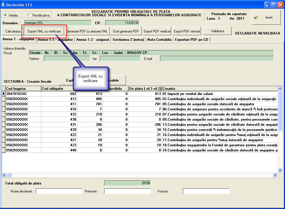 Generarea si verificare fisierului XML se face din ecranul declaratiei 112. apasand butonul "Export XML"