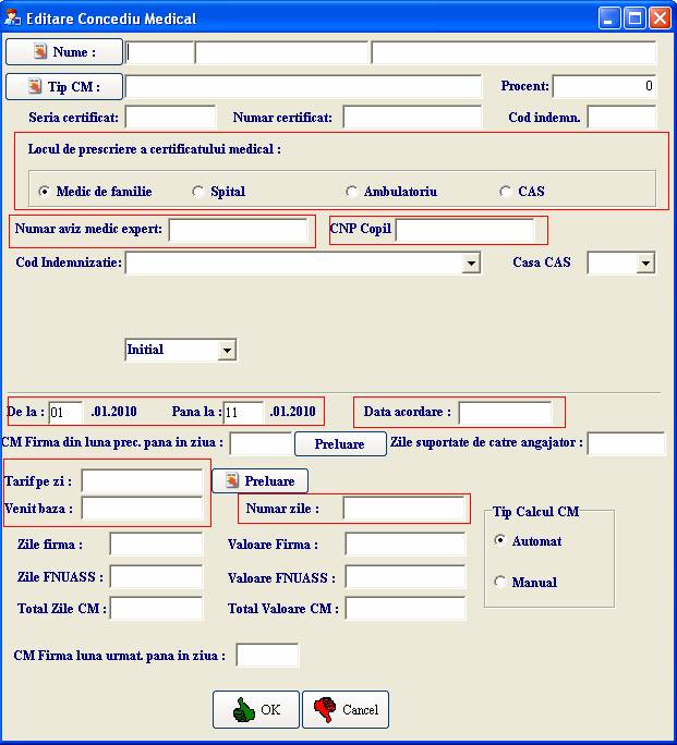 Incepand cu data de 08.06.2010, in conformitate cu ordinul MS/CNAS nr. 430/470/2010 pentru modificarea si completarea Normelor de aplicare a prevederilor OUG nr. 158/2005 privind concediile medicale si indemnizatiile de asigurari sociale de sanatate, aprobate prin Ordin MS/CNAS nr. 60/32/2006, s-au operat urmatoarele modificari in Sistemul de Gestiune Personal Salarizare BANI 2010.