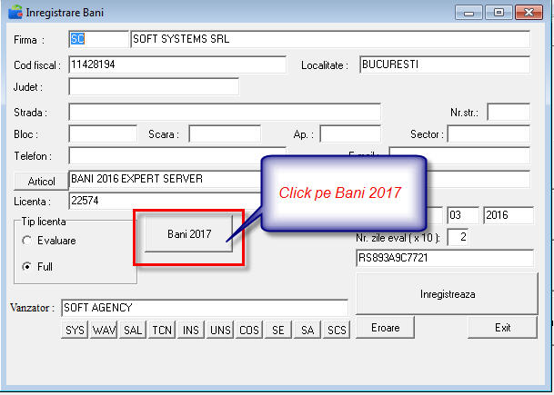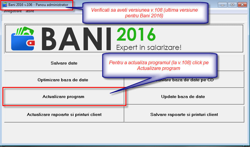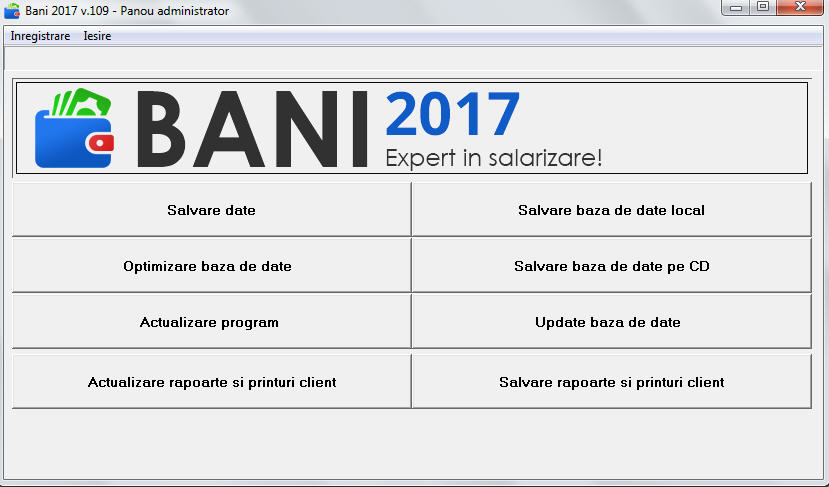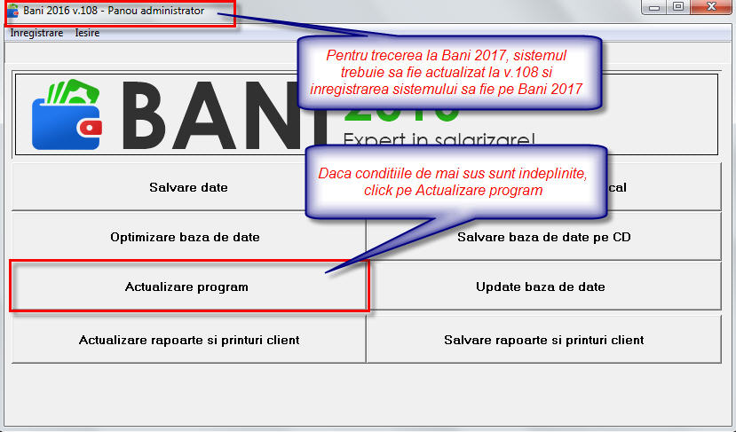 3. Dupa ce s-a actualizat la versiunea v.108, accesati meniul Inregistrare -> Panou Administrator in partea de jos apare butonul Bani 2017 il apasati si programul va intra in evaluare pe noua versiune. Anumite functii vor deveni active numai dupa confirmarea platii, cand veti primi si inregistrarea definitiva a sistemului.