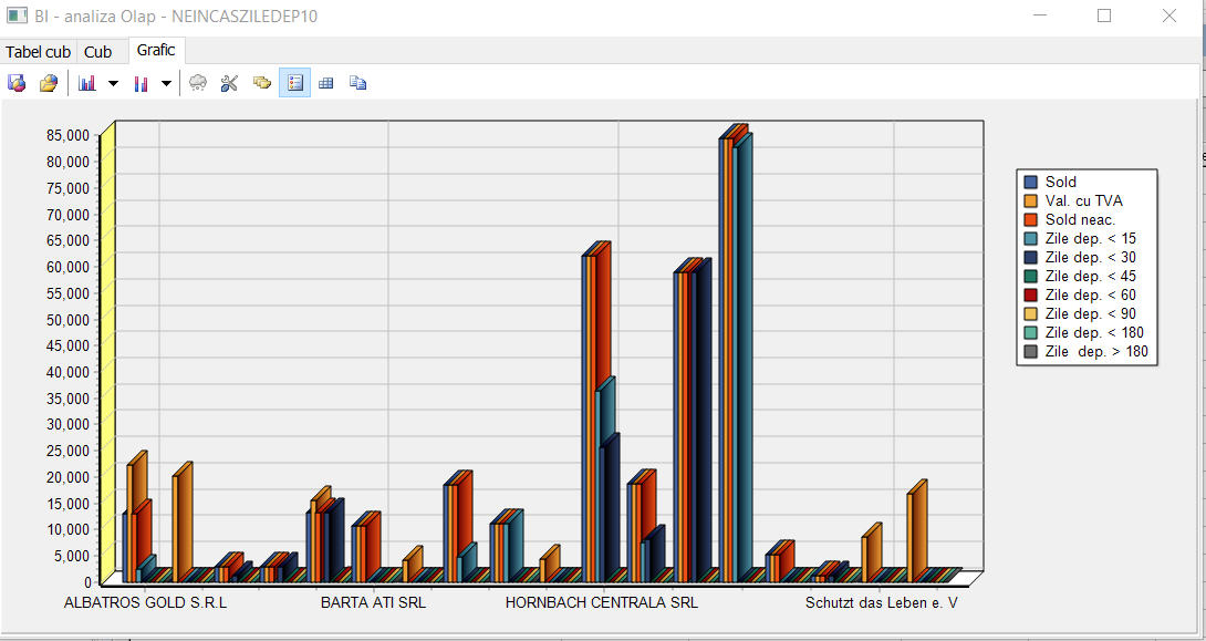 Din afisarea interactiva tabelara se poate trece in reprezentarea grafica a rapoartelor printr-o noua componenta de alegere a tipului de grafic in functie de obiectivele pe care le urmaresti.